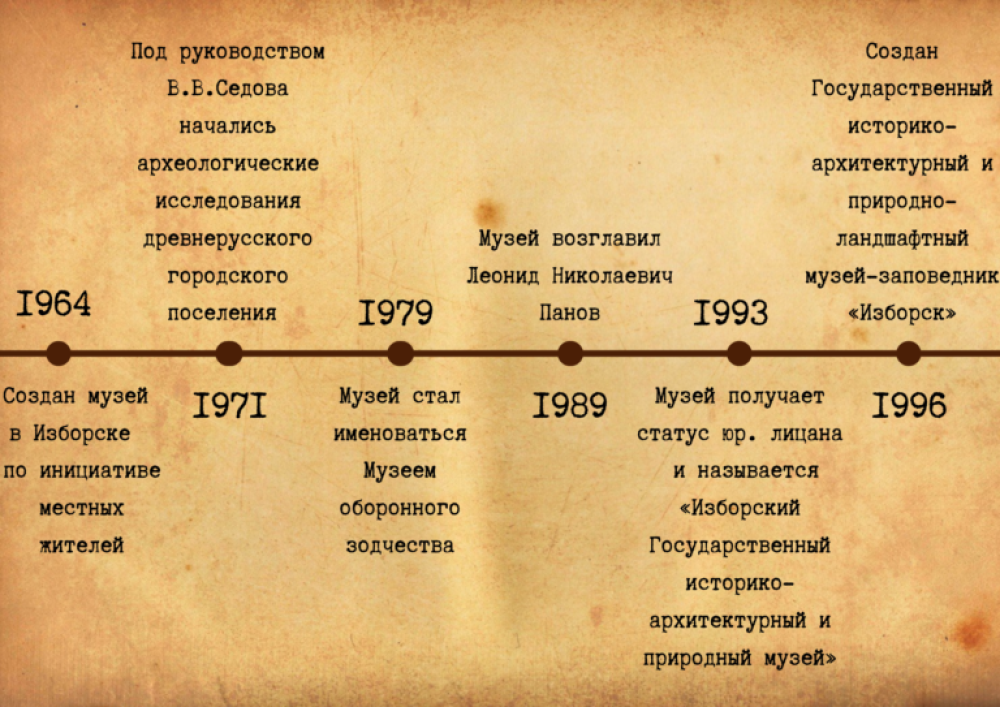 Музей в Изборске был создан в 1964 году по инициативе местных жителей. Он работал на общественных началах при библиотеке. Первым его директором стал Сергей Алексеевич Щербаков, неутомимый краевед. Его соратниками и единомышленниками были сотрудники библиотеки Валентина Дмитриевна Розова, Василий Васильевич Воронков, Николай Иванович Ерофеев. С первых дней в музей стали поступать археологические артефакты – находки изборян, предметы быта, документальные материалы.