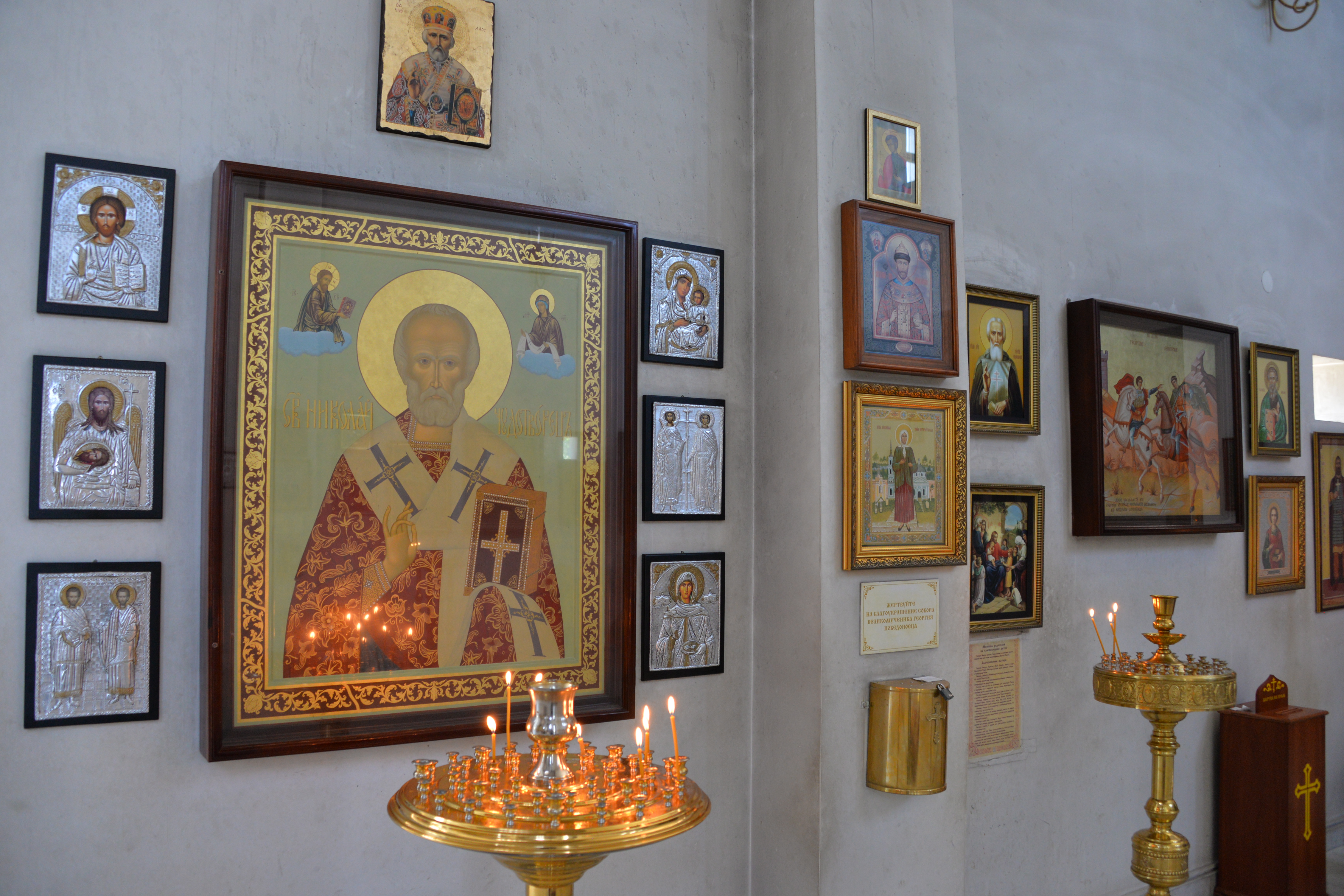 Есть в храме чтимые образы святого великомученика и Победоносца Георгия, святителя Николая Чудотворца, святого великомученика и целителя Пантелеимона, святой равноапостольной Нины и святого царя-страстотерпца Николая.