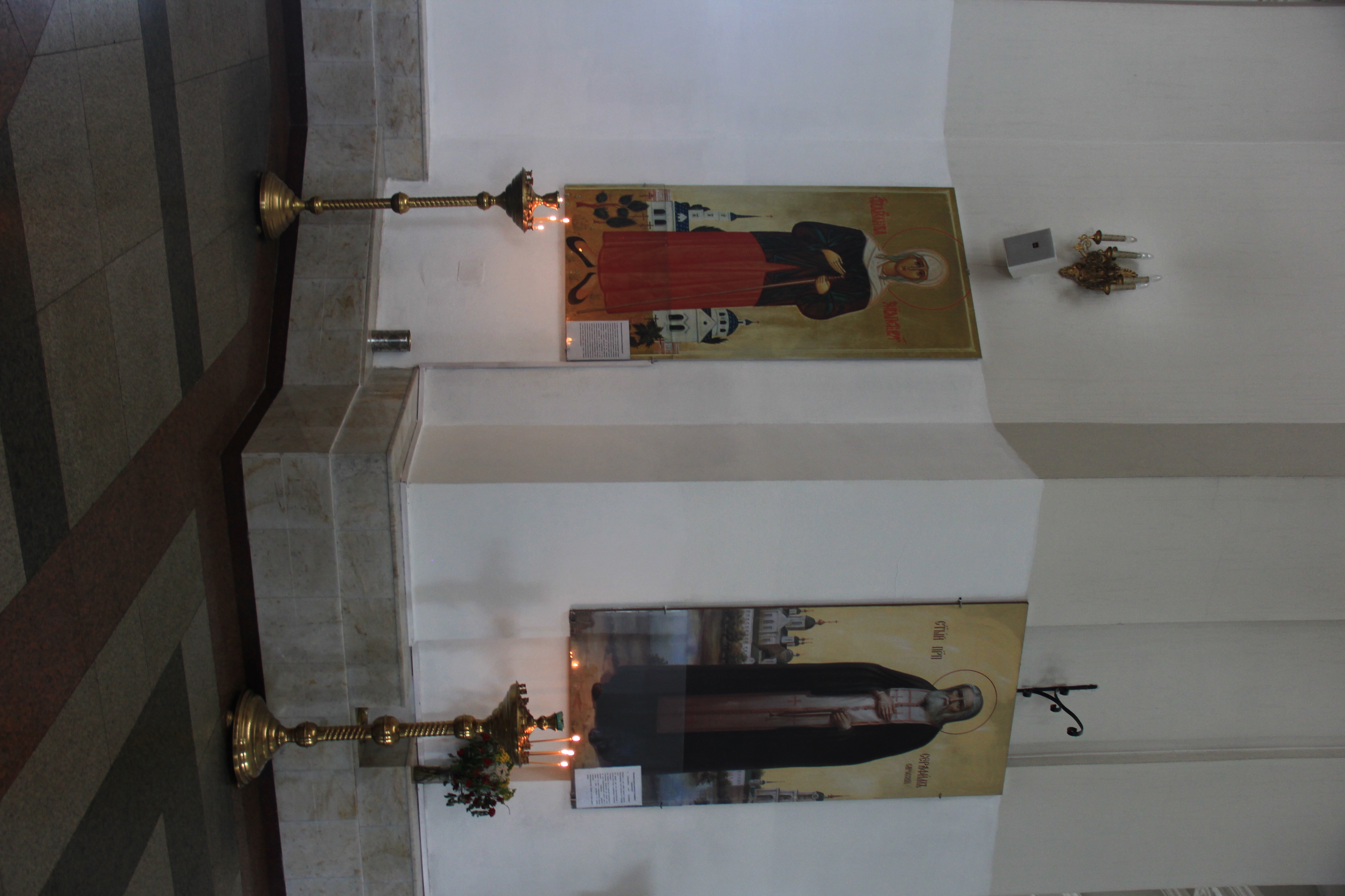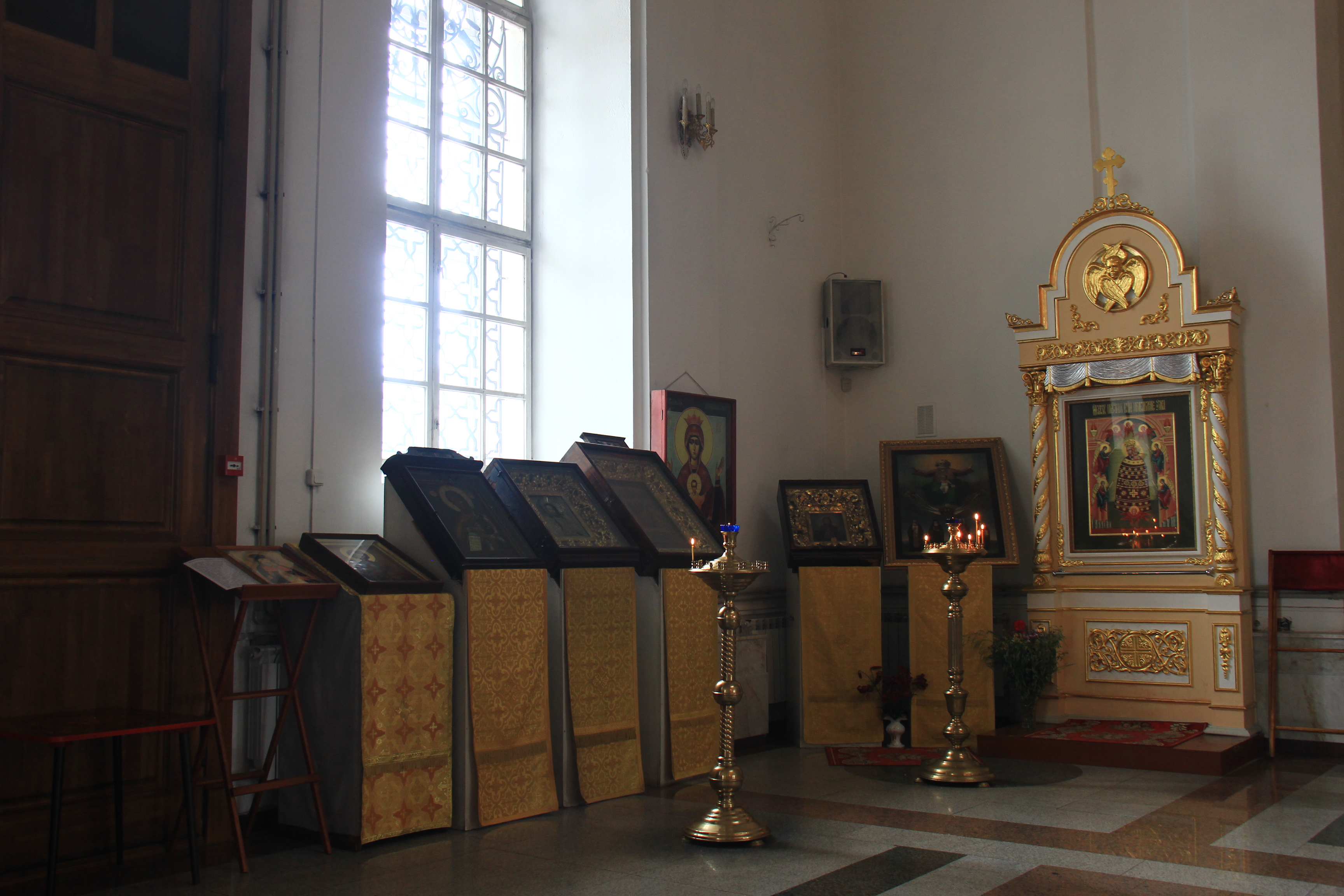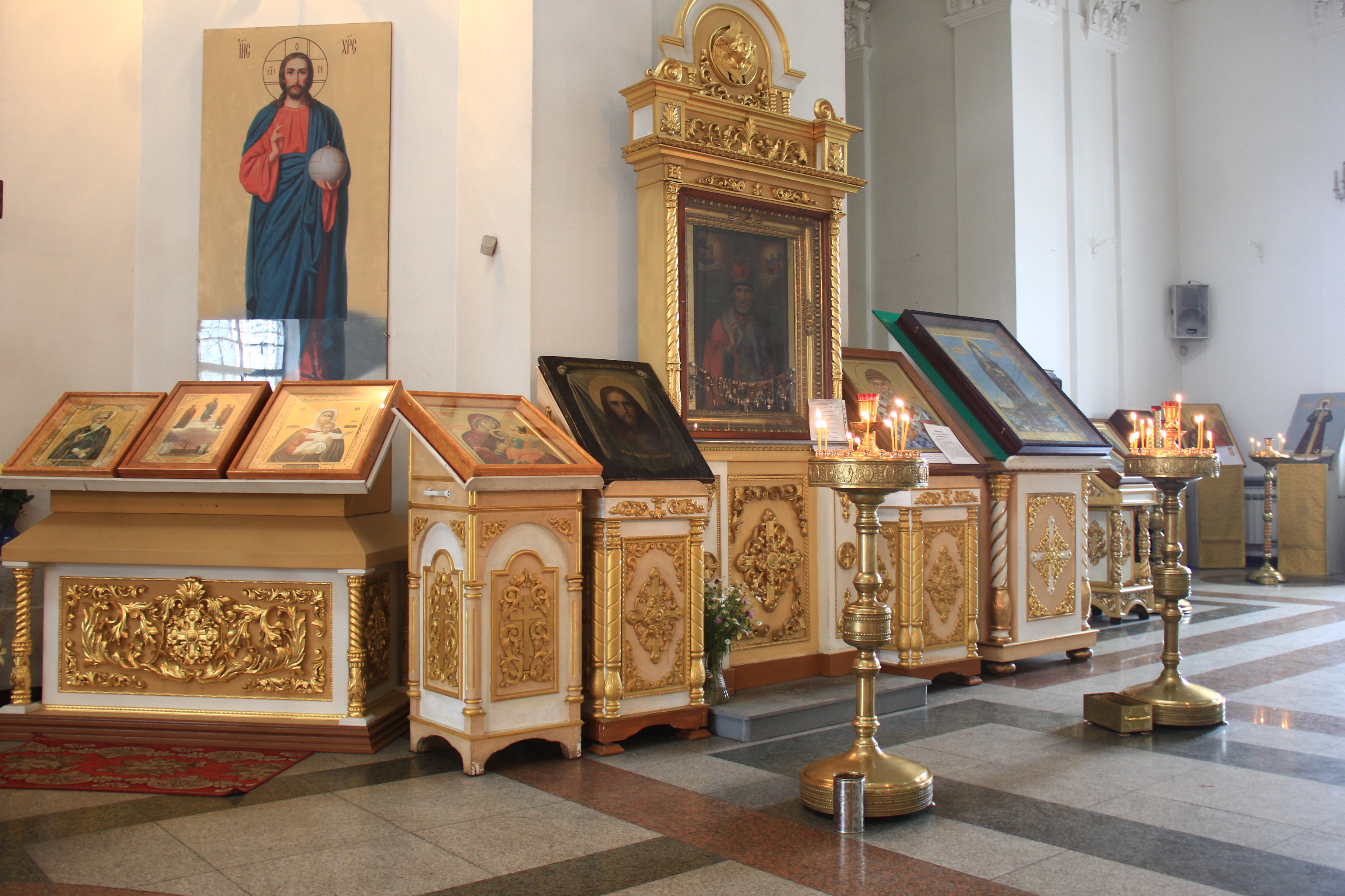 Но не только внешним благолепием был известен Рыбинский собор. Здесь пребывали и местночтимые святыни. Перед правым клиросом главного алтаря стоял древний массивный деревянный крест, особенно чтимый местными жителями, по преданию раньше находившийся в часовне на окраине города. Изображение Распятого Спасителя имело терновый серебряный, вызолоченный венец с жемчужною пронизкою, а «препоясание» — из чистого жемчуга. Перед левым клиросом находился серебряный, весом более пуда киот с образом Югской Божией Матери в жемчужной ризе с алмазною звездой. В летнее время этот киот вместе с образом уступал место чудотворным иконам, приносимым в Рыбинск из Мологи, Ярославля и Югского монастыря. За левым клиросом Петропавловского придела находилась киота с несколькими мелкими иконами, врезанными в одну позлащенную деку — эта икона была в походе Рыбинской дружины во время войны 1853-1856 гг. и по окончании войны пожертвована в собор.